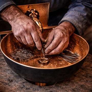 Hand-forged from high-gauge copper and solid brass, our basins are engineered to be the focal point of the modern sanctuary. Each piece features a unique, hand-hammered texture that captures the light and develops a rich character over time. Functional art for those who demand permanence and precision.